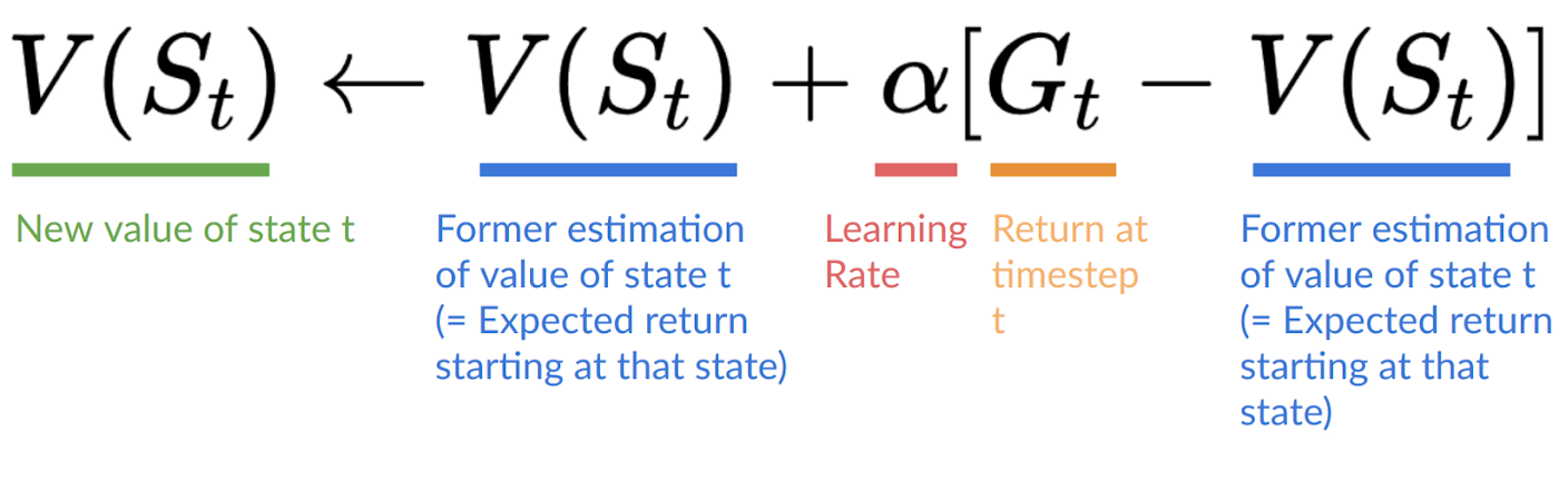 - In Temporal Difference Learning, we update the value function from a step, and then we replace the return with an estimated return called the TD target.