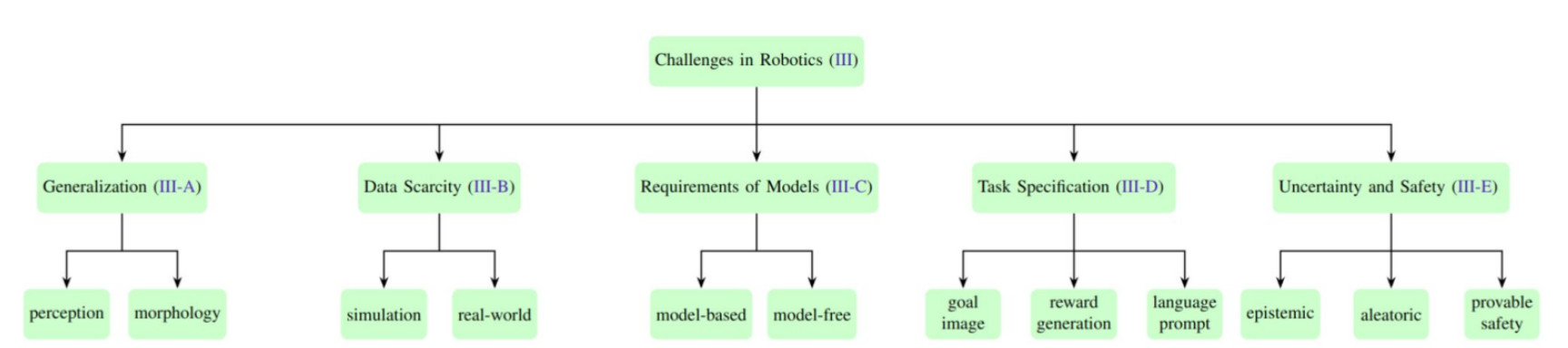 - Data Scarcity: Data is essential for deep learning-based methods, but the huge range of tasks and environments makes it hard to create large-scale datasets. Simulation is one of the leading ways to help solve this, where synthetic data and techniques like domain randomization, help improve generalization and faster training.