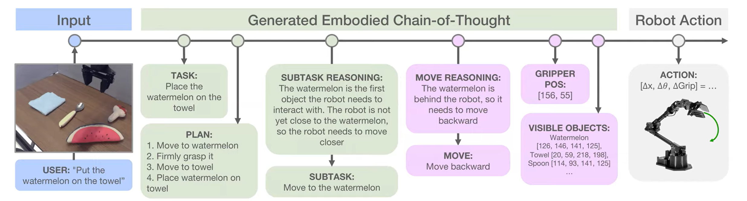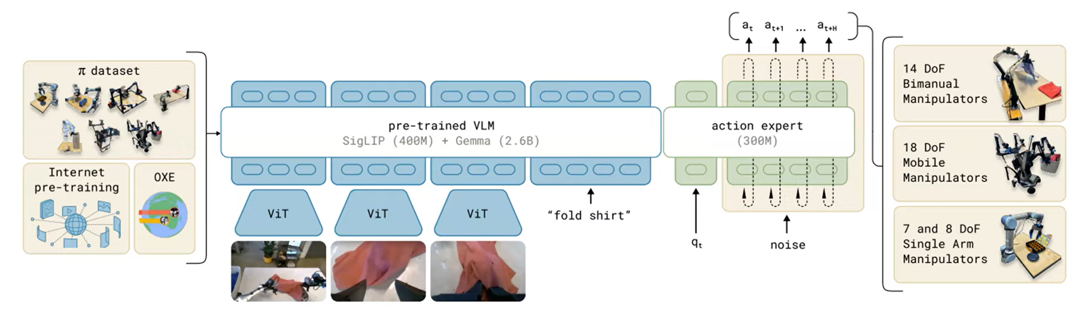 - Takes internet-scale pre-training data + Open X-embodiment dataset + collected task data, and combines that with a pre-trained VLM (PaliGemma), with another flow-matching model (action expert), to produce continuous actions.